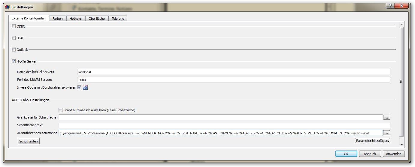 c:\Programme\ELS_Professional\AGFEO_Klicker.exe --R %NUMBER_NORM% --V %FIRST_NAME% --N %LAST_NAME% --P %ADR_ZIP% --O %ADR_CITY% --S %ADR_STREET% --I %COMM_INFO% --W2 --W6 --auto --exit