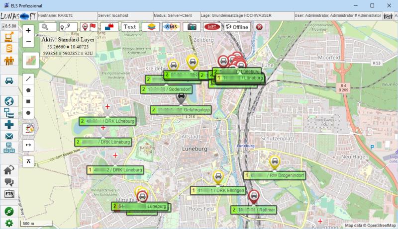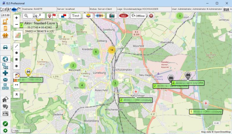 In Abhängigkeit vom Zoomfaktor werden die Einsatzmittel entweder zusammengefasst oder einzeln dargestellt. Das erhöht die Übersichtlichkeit im Vergleich mit herkömmlichen Lagekarten enorm.
