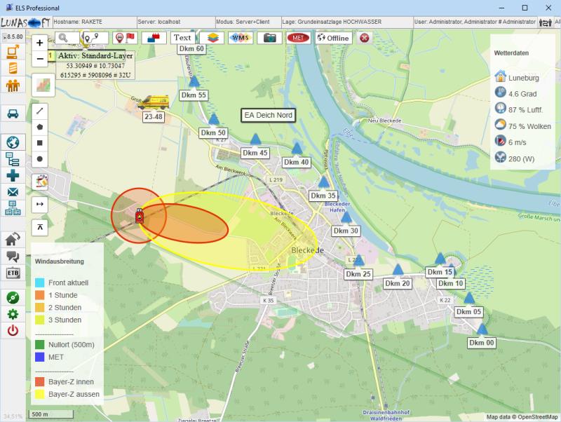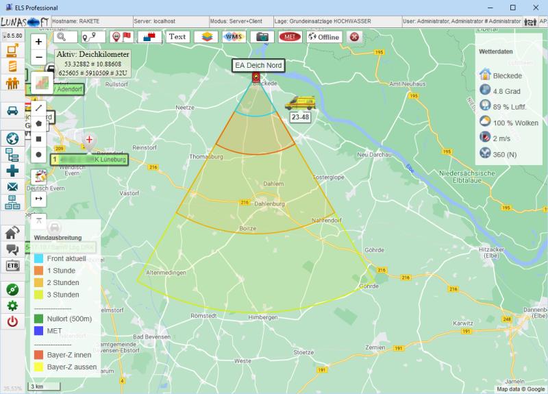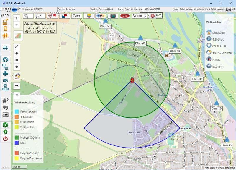 Die Ausbreitung wird berechnet auf Basis der Windgeschwindigkeit und der Windrichtung, ausgehend von der Unglückszeit.