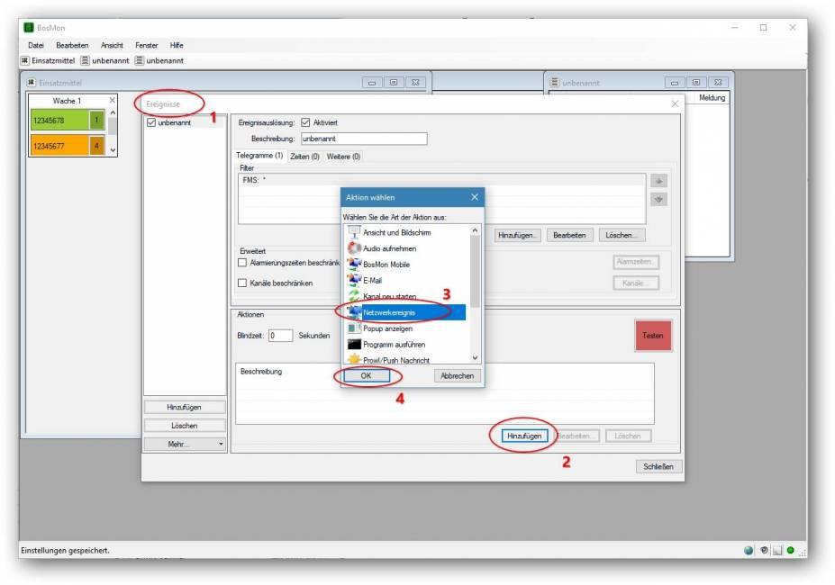 In BOSMON im Menü „Bearbeiten“ → „Telegrammereignisse“ mit dem Button „Hinzufügen“ ein neues Netzwerkereignis zufügen: