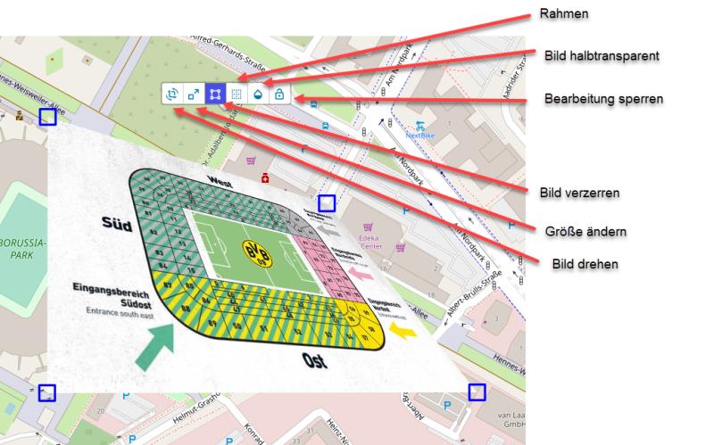 Direkt nach dem Einfügen wird das Bild im Kartenmittelpunkt platziert. Jetzt kann es gedreht, verzerrt und in der Größe angepasst werden: