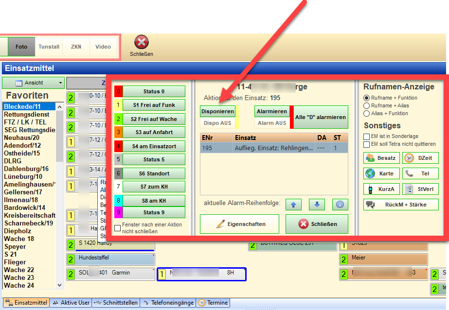 Ein Einsatzmittel zu disponieren bedeutet, es für einen Einsatz vorzumerken. Sendet ein Einsatzmittel, dass für einen Einsatz disponiert ist, den Status 3, so wird es automatisch diesem Einsatz zugeordnet.