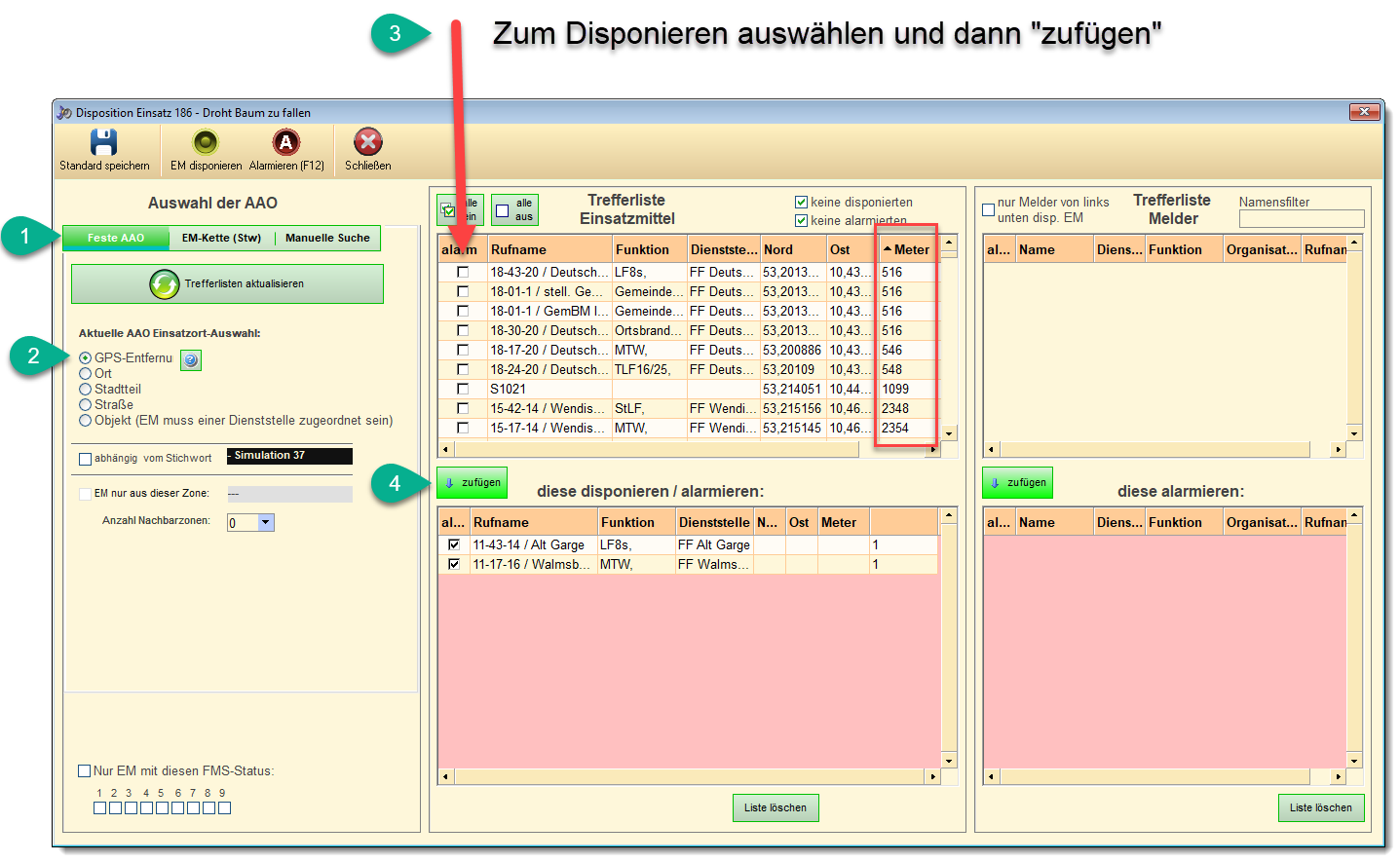 Nach der Ermittlung der Entfernung der ausgewählten Einsatzmittel kann ein / mehrere gewünschte Einsatzmittel selektiert und zum aufliegenden Einsatz disponiert werden.