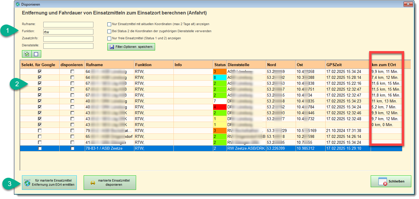 3) Disposition über die Entfernung zum Einsatzort (Echtzeitberechnung der Anfahrt)