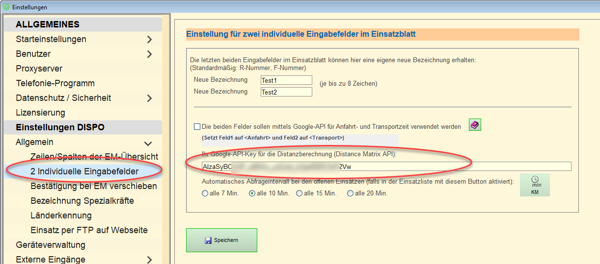 Voraussetzung für die Echtzeitberechnung ist ein Google API-Key für die Distance Matrix