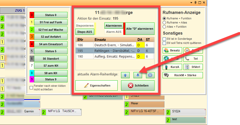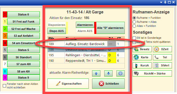 Wenn dieses Einsatzmittel dann in einem Einsatz frei wird und den Status 1 oder 2 drückt, wird es aus dem Einsatz entfernt. Bis dahin ein normaler Vorgang. Ist das Einsatzmittel aber zuvor für einen oder mehrere weitere Einsätze disponiert worden, so wird es automatisch dem nächsten Einsatz in der obigen Liste zugeordnet, wenn es jetzt wieder den Status 3 an die Leitstelle sendet.