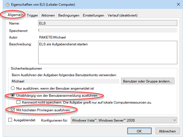 Wenn ELS als Aufgabe startet, hat es später keine Benutzeroberfläche Daher einen Windows-Benutzer wählen, der keine Eingaben an ELS machen muss. |