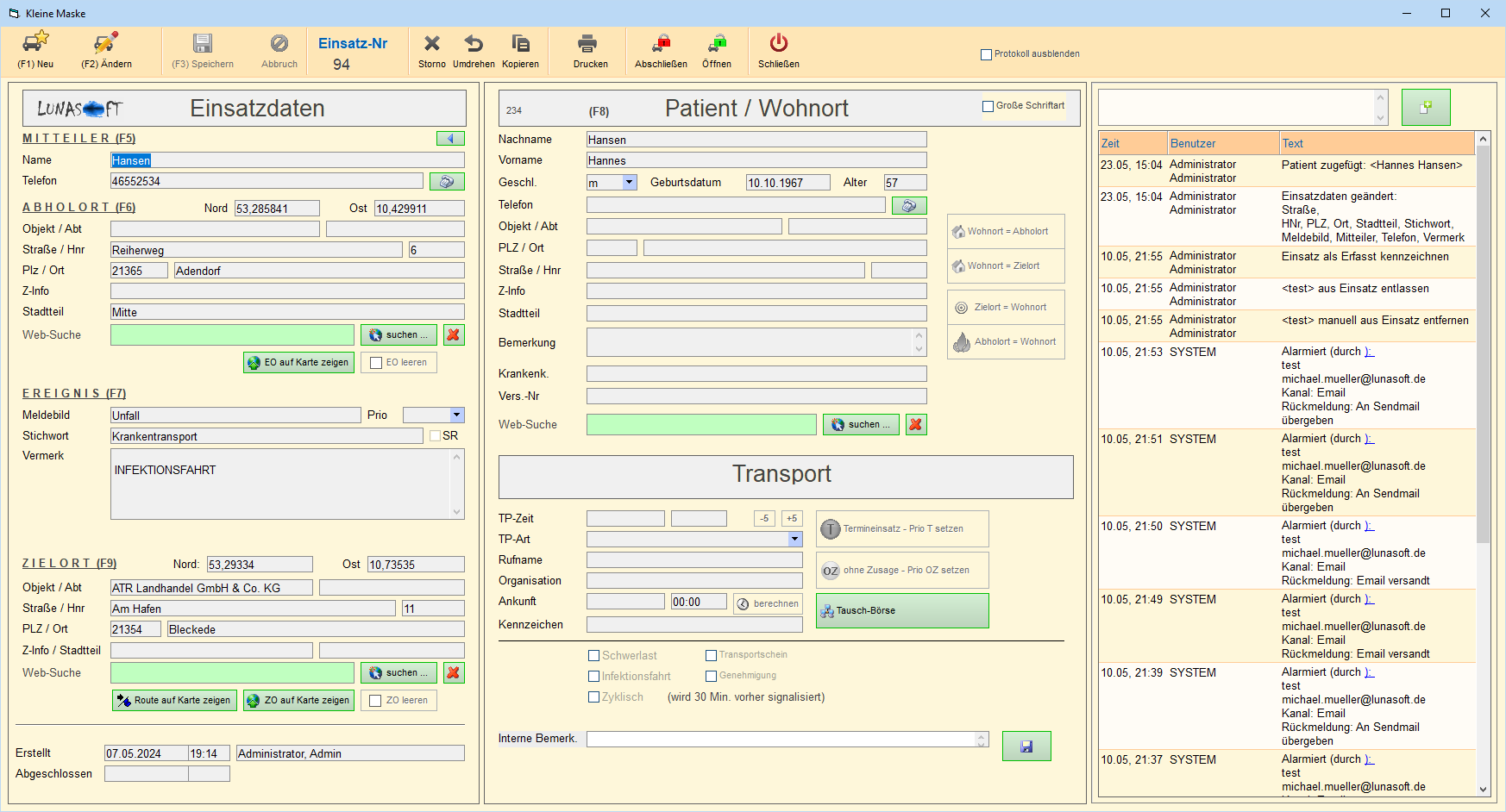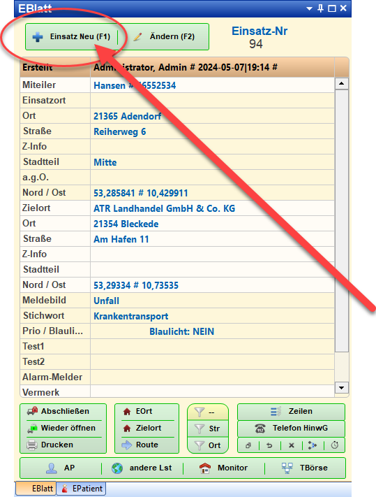 Mit Speichern wird eine neue Einsatznummer erzeugt und der Einsatz gespeichert.