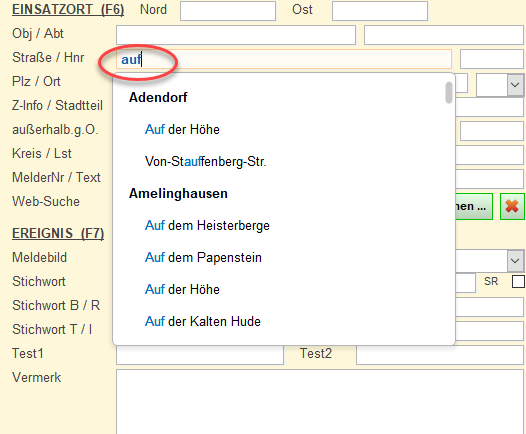 Bei einigen Eingabefeldern erscheint nach Eingabe weniger Buchstaben ein Autovervollständigungsliste (soweit diese in den Stammdaten eingepflegt sind):