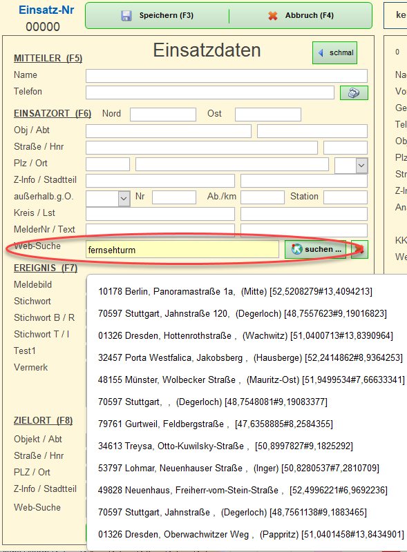 Damit der Einsatzort später auf der Einsatzkarte angezeigt werden kann, sind Koordinaten erforderlich. Die ermittelt ELS-Professional beim Speichern Online bei Open-Street-Map