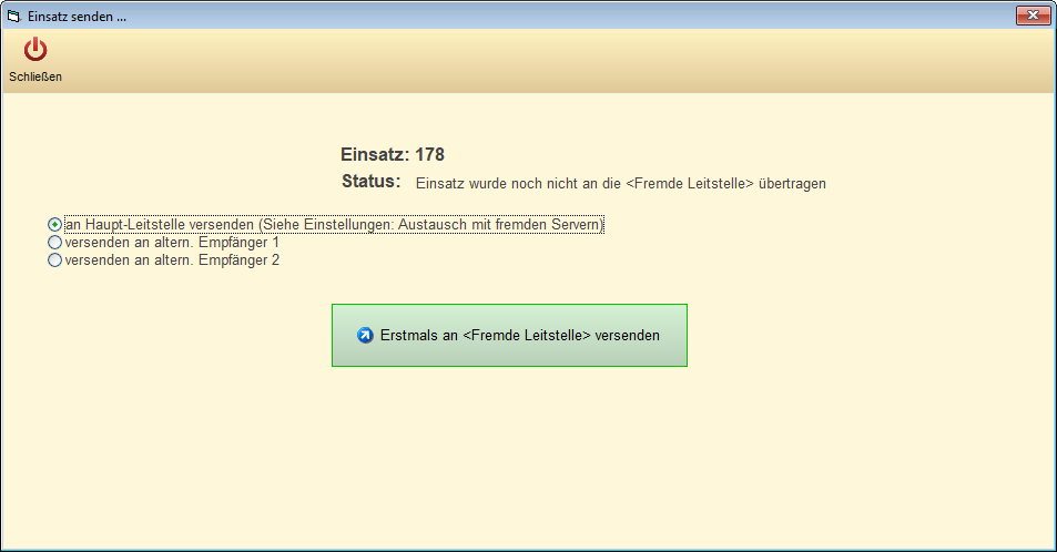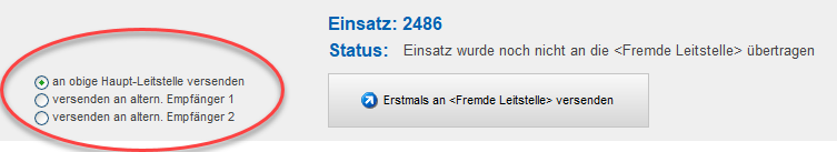 Das ist die Standardmäßig verwendete IP-Adresse der fremden Leitstelle. Um vorübergehend auch mehrere fremde Leitstellen adressieren zu können, gibt es zwei weitere alternative Empfänger. Hier wird vor dem Versenden ausgewählt, welcher Empfänger den Einsatz erhalten soll: