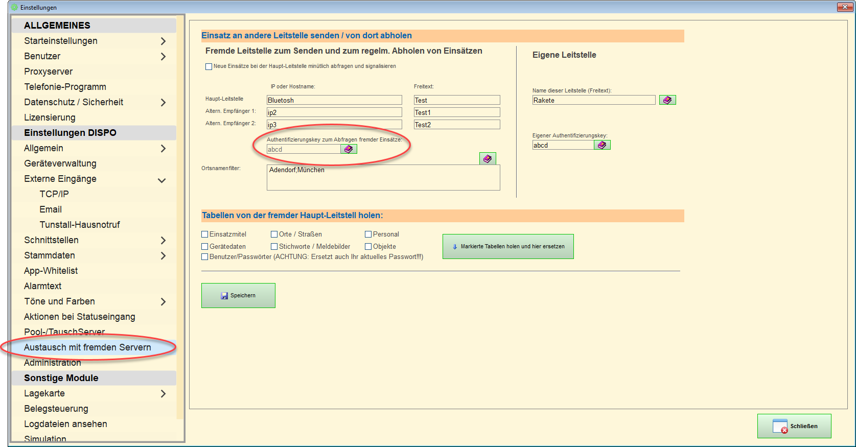 Damit nicht jede Leitstelle unkontrolliert die Einsätze einer übergeordneten Leitstelle abholt, ist ein Key erforderlich. Dieser Key der fremden Leitstelle wird dort eingetragen.