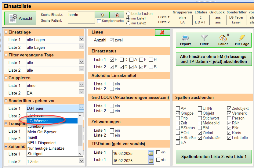 Die Einsatzliste zeigt ELS-Einsätze an.