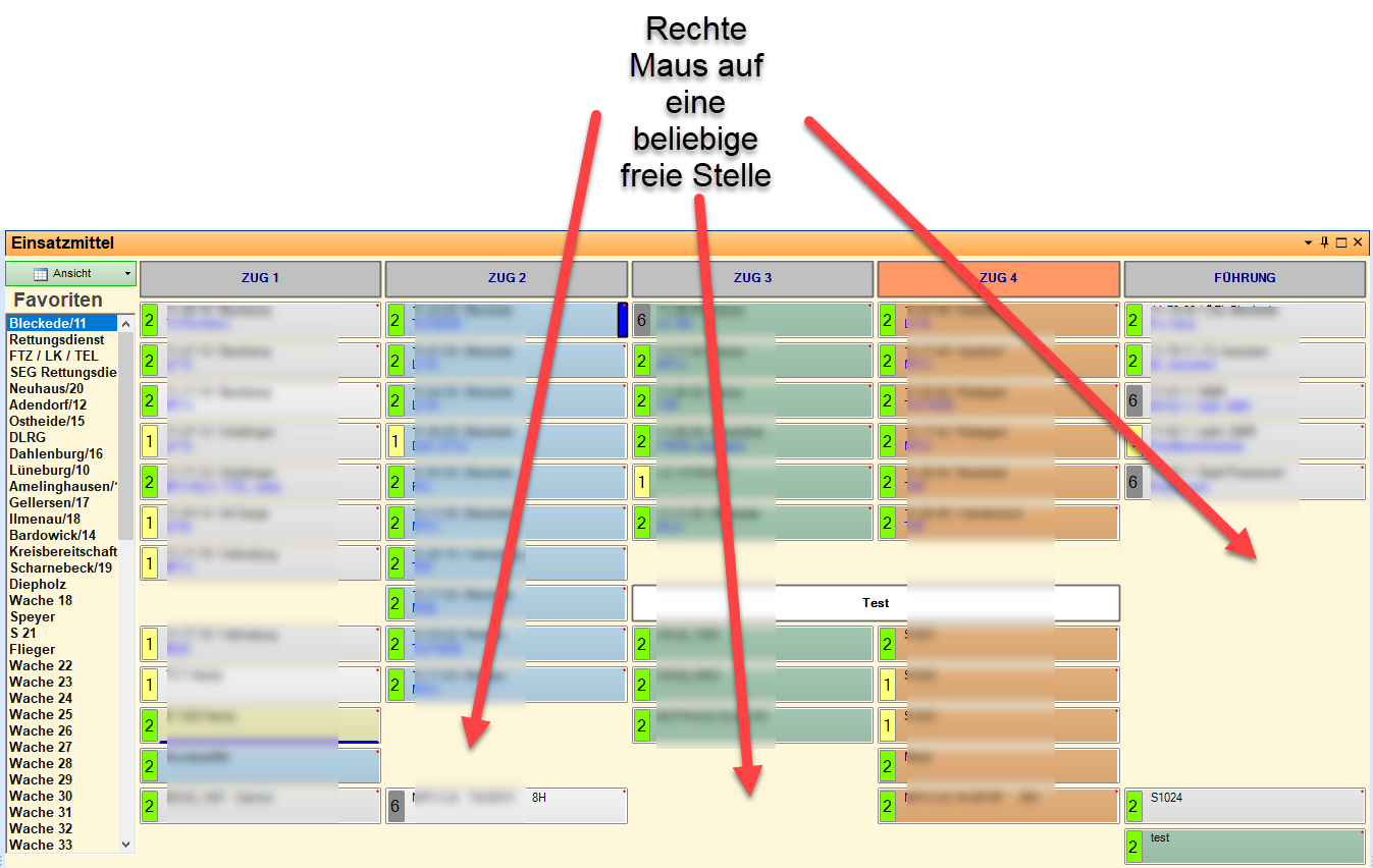 Das Verschieben in einen anderen Favoriten geschieht durch Drag&Drop auf den entsprechenden Favoriten-Namen (dort wenige Sekunden halten). Dadurch öffnet sich das gewählten Favoriten-Fenster, in dem das Einsatzmittel nun an beliebiger Stelle abgelegt werden kann.