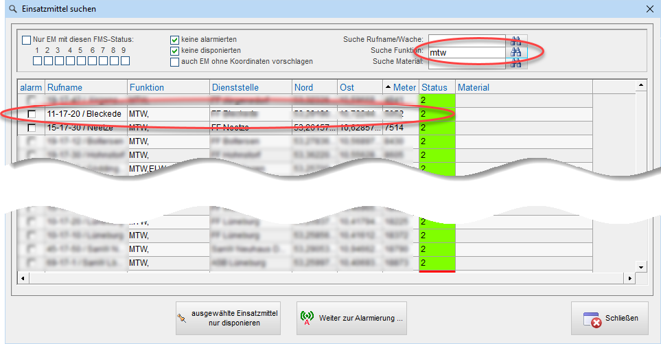 - Bei der Disposition kann nach Einsatzmitteln eines bestimmten Typs gesucht werden