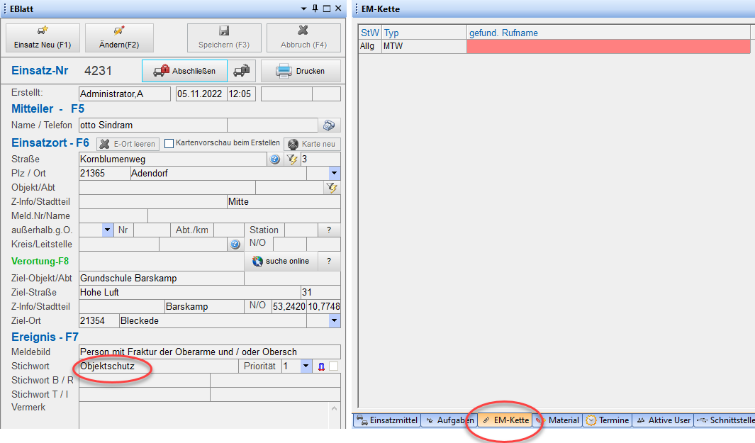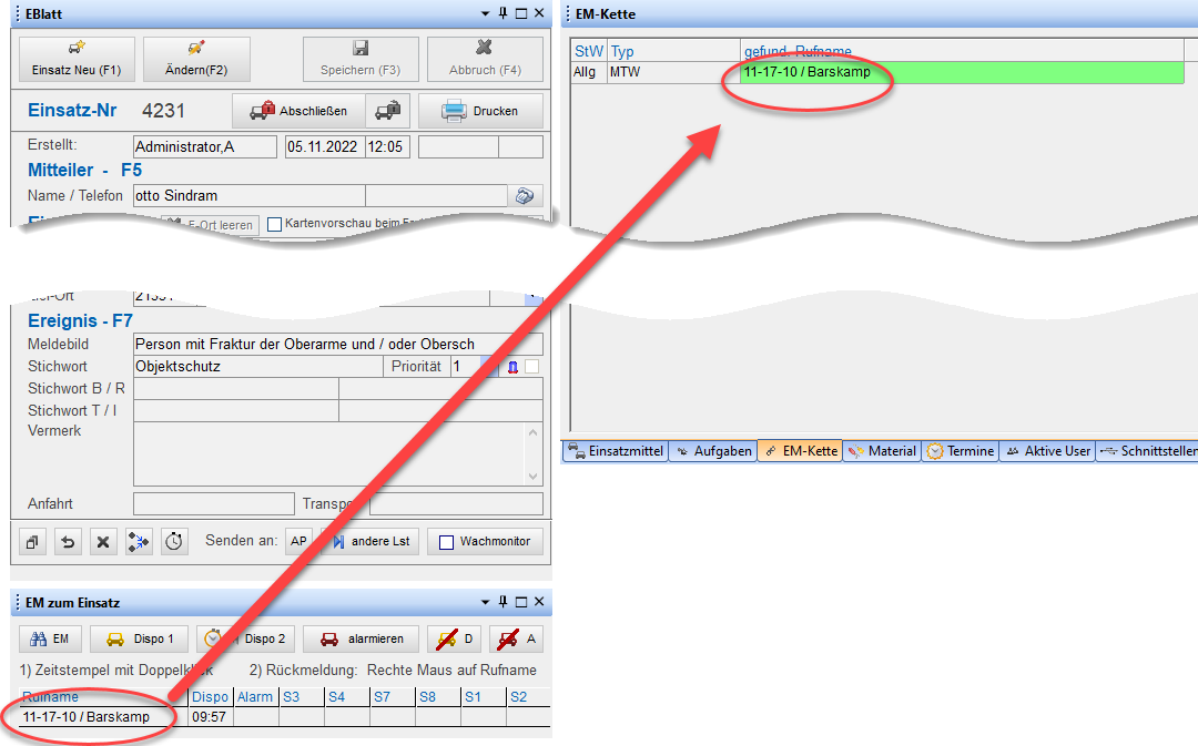 Die Anzeige erfolgt im Einsatzblatt unter "EM-Kette"