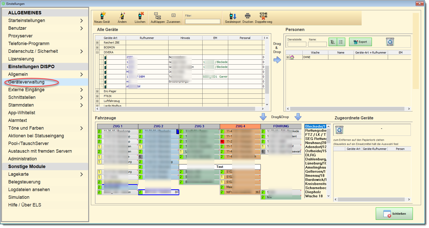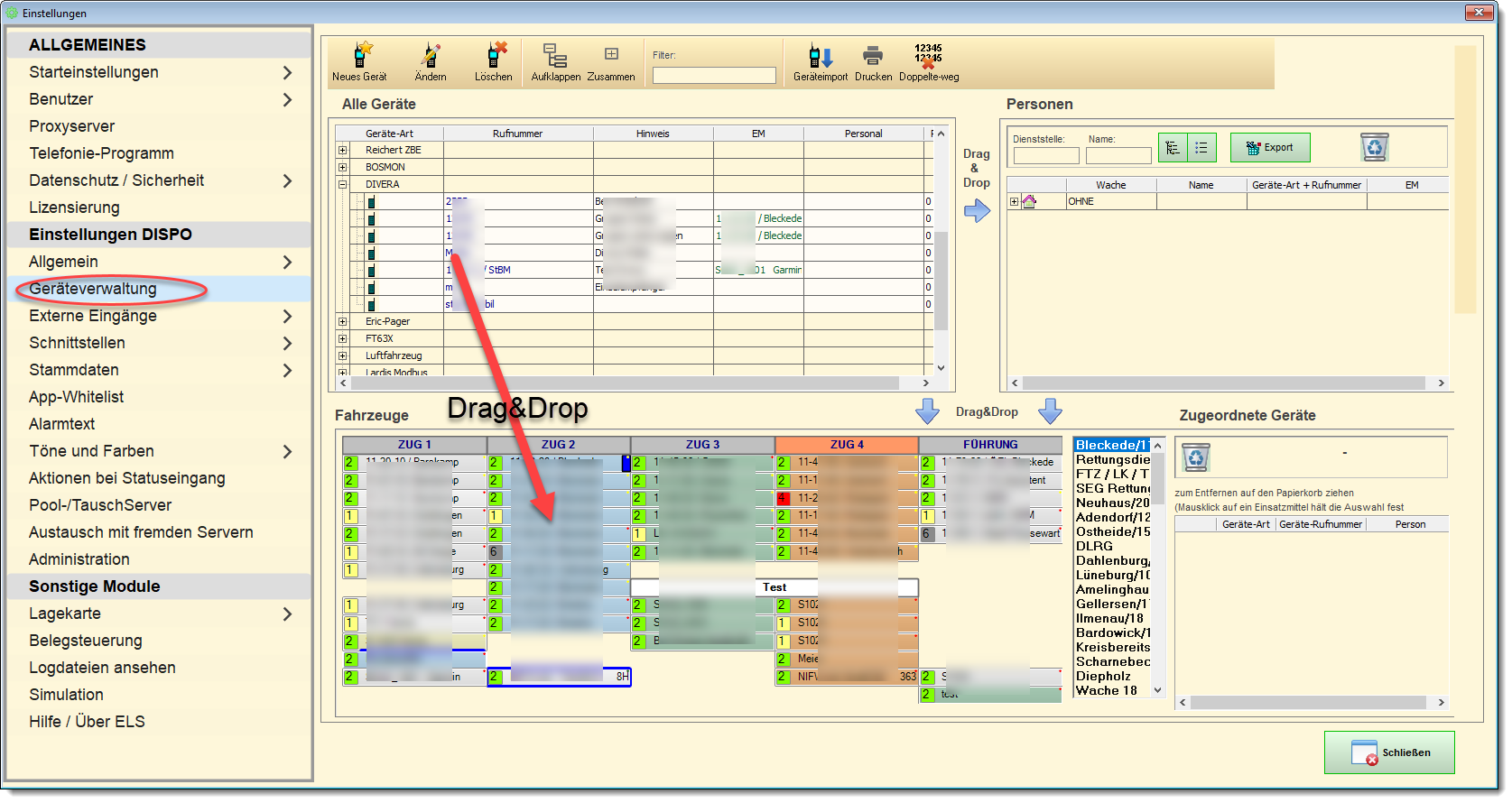 - Die Geräte werden zuerst in den Stammdaten erfasst und später den einzelnen Einsatzmitteln per Drag&Drop zugeordnet.