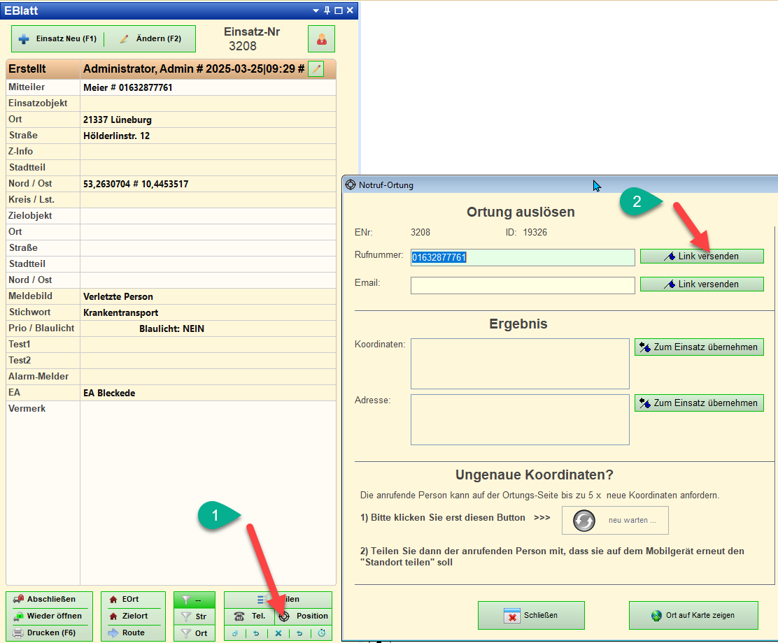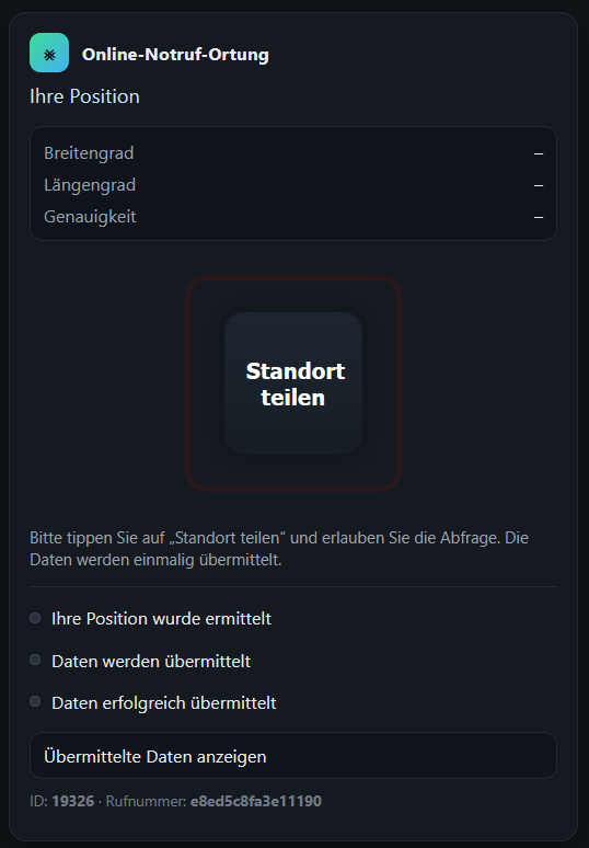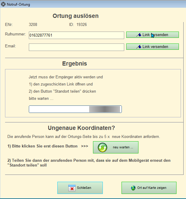 Sollten die Koordinaten zu ungenau sein (> 500 Meter oder mehr), dann kann aus ELS heraus man eine erneute Abfrage starten, ohne der anrufenden Person den Link neu zuzusenden. Denn diesen hat er ja noch verfügbar und vielleicht sogar noch geöffnet. Falls nicht, kann die anrufende Person den sleben Link jederzeit nocheinmal öffnen und den Vorgang wiederholen. Die anrufende Person muss einfach auf ihre mündliche Anforderung hin den Button "Standort teilen" nochmals drücken. Sagen sie ihm einfach: "Ihre Koordinaten sind eingetroffen. Sie sind aber etwas ungenau. Bitte drücken sie den Button <Standort teilen> jetzt noch einmal."