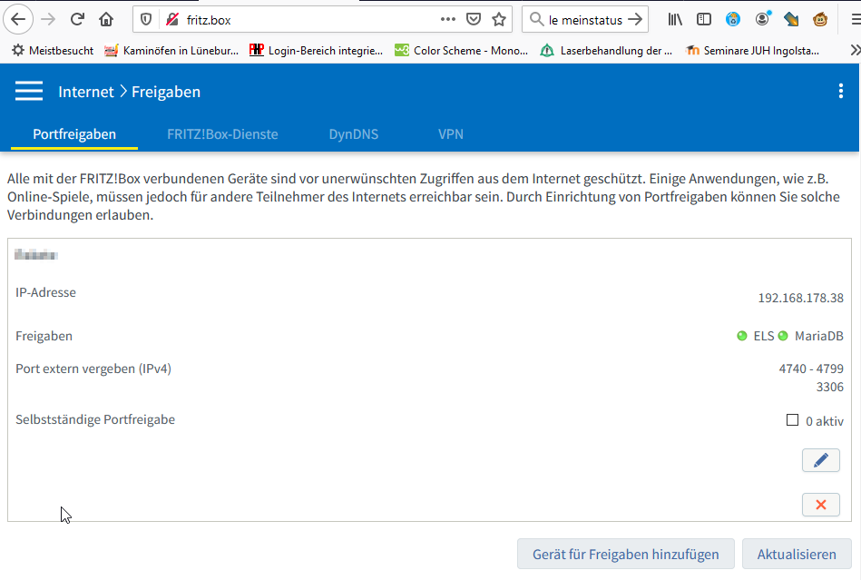 So sieht eine Portfreigabe in der Fritzbox aus: