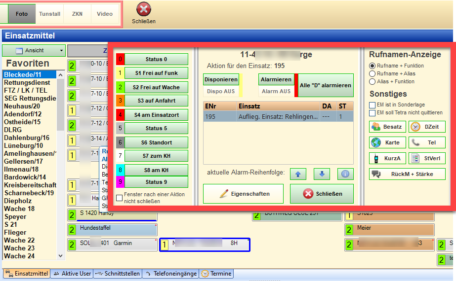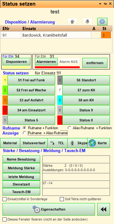 Beim Rechtsklick auf ein Einsatzmittel in der normalen Einsatzmittel-Übersicht öffnet sich das Statusfenster, in dem nachfolgende Aktionen durchgeführt werden können: