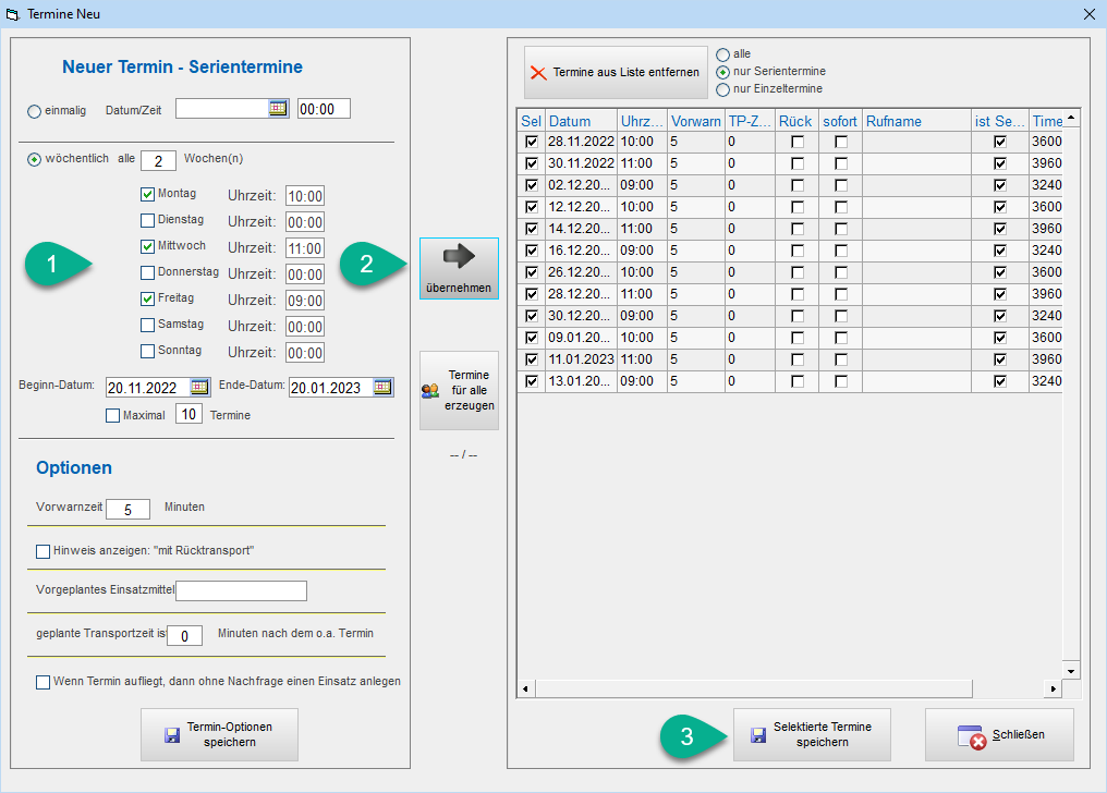 Übernehmen fügt die berechneten Termine in die Terminliste (rechte Seite) ein. Hier könnte man einzelne Termine nun vor dem Speichern abwählen.