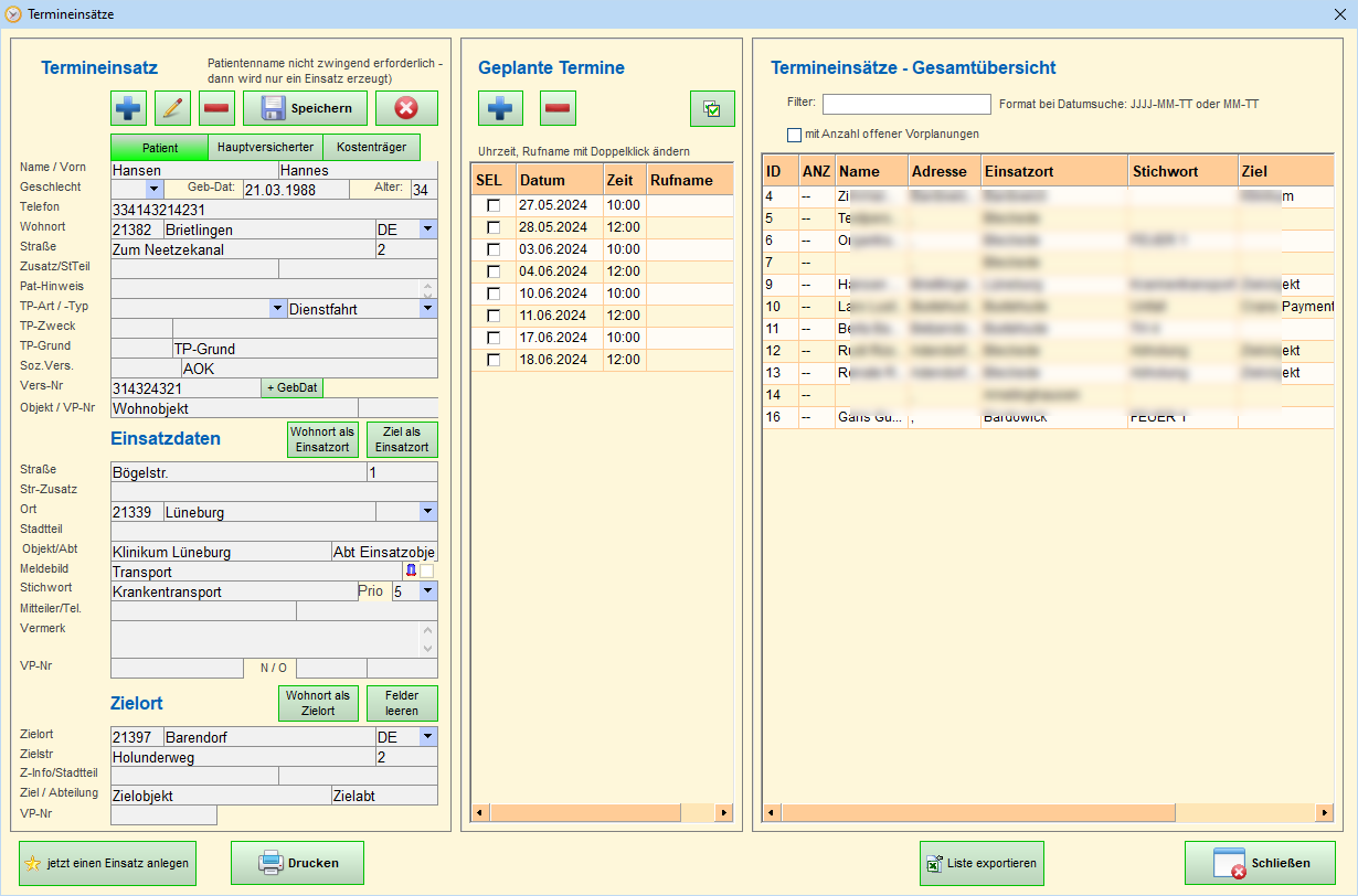 Der Patient wird hier neu erfasst. Danach kann er in der Gesamtliste (rechte Seite) ausgewählt und seine gesamten Termine angezeigt werden: