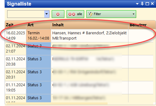 Neuer Eintrag in der Einsatzliste, beachte: