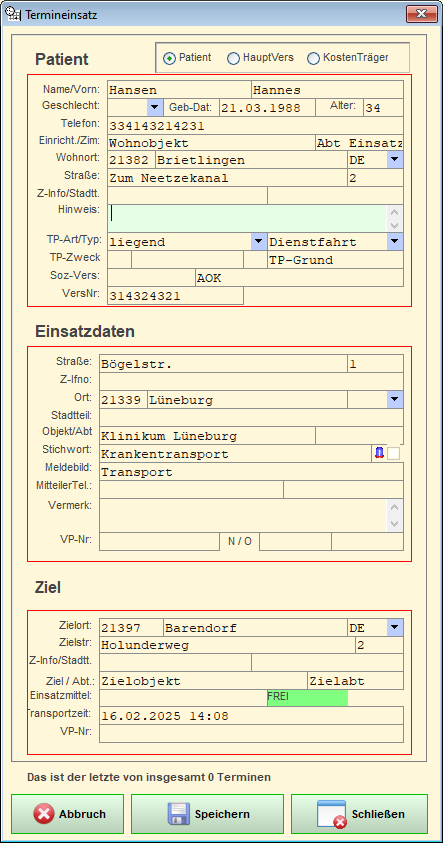 Dort können Patienten neu erfasst werden. Beim Ausfüllen einer neuen Terminfahrt kann über Autovervollständigung des Nachnamens ein Patient von dort übernommen werden oder umgekehrt, ein nicht vorhandener Patient in die Stammdaten übernommen werden.